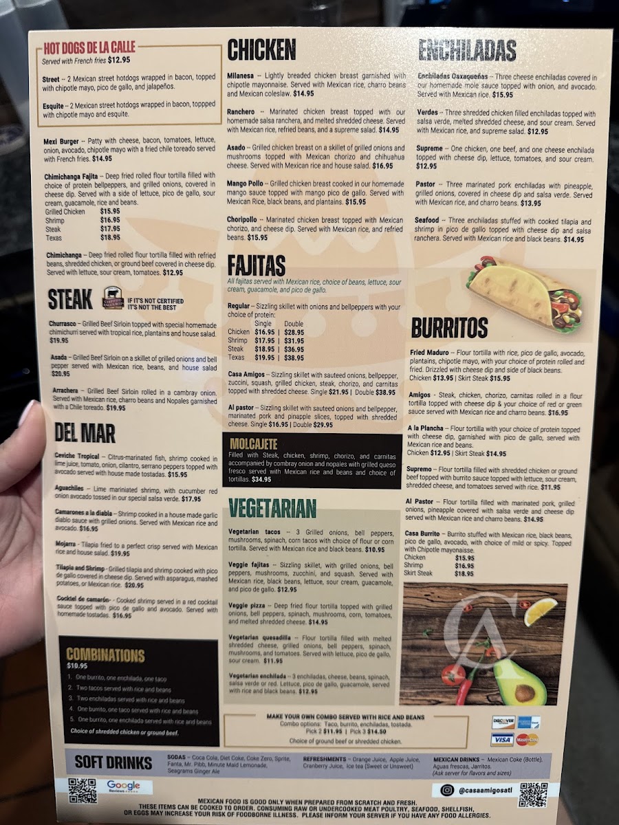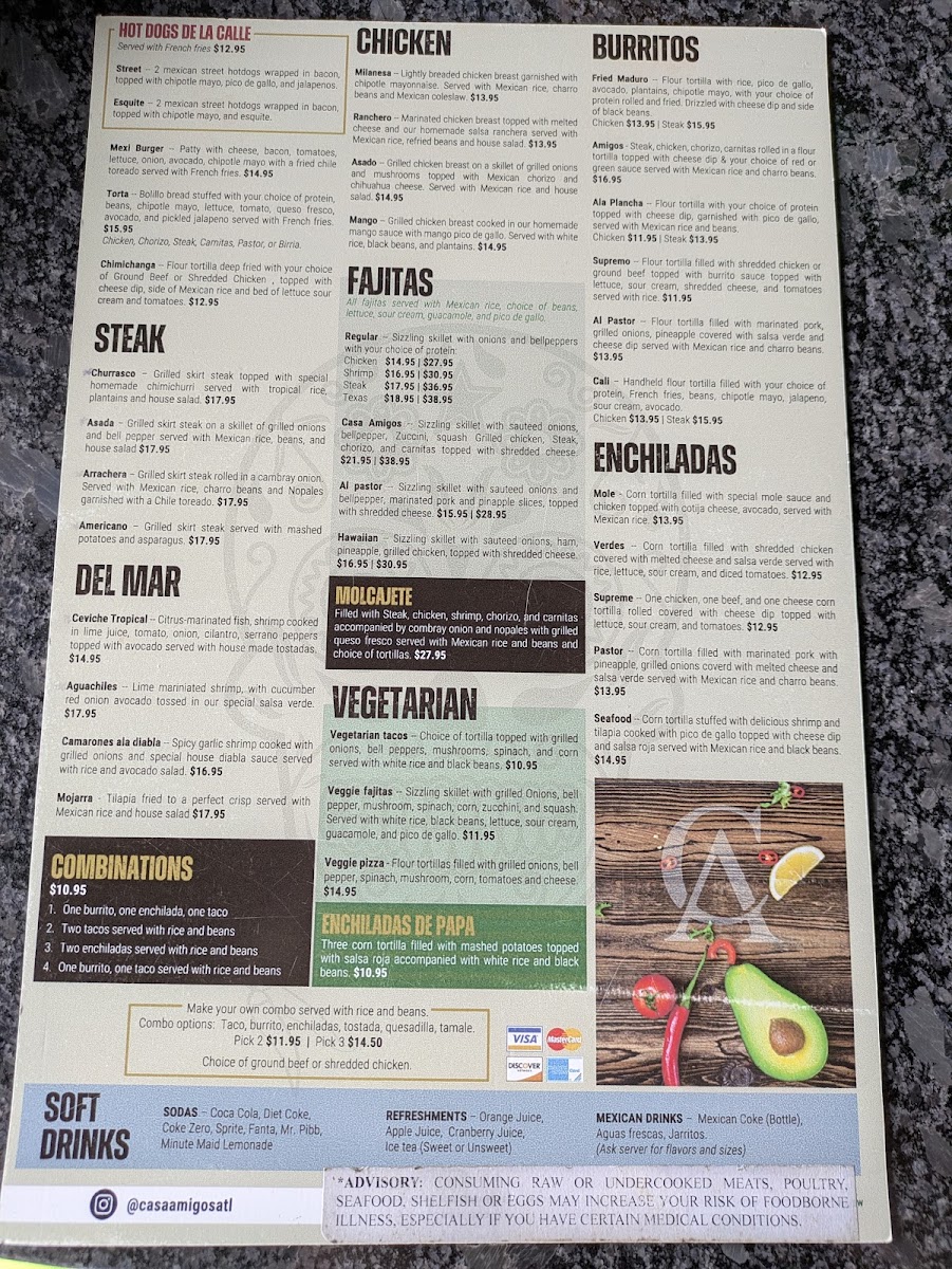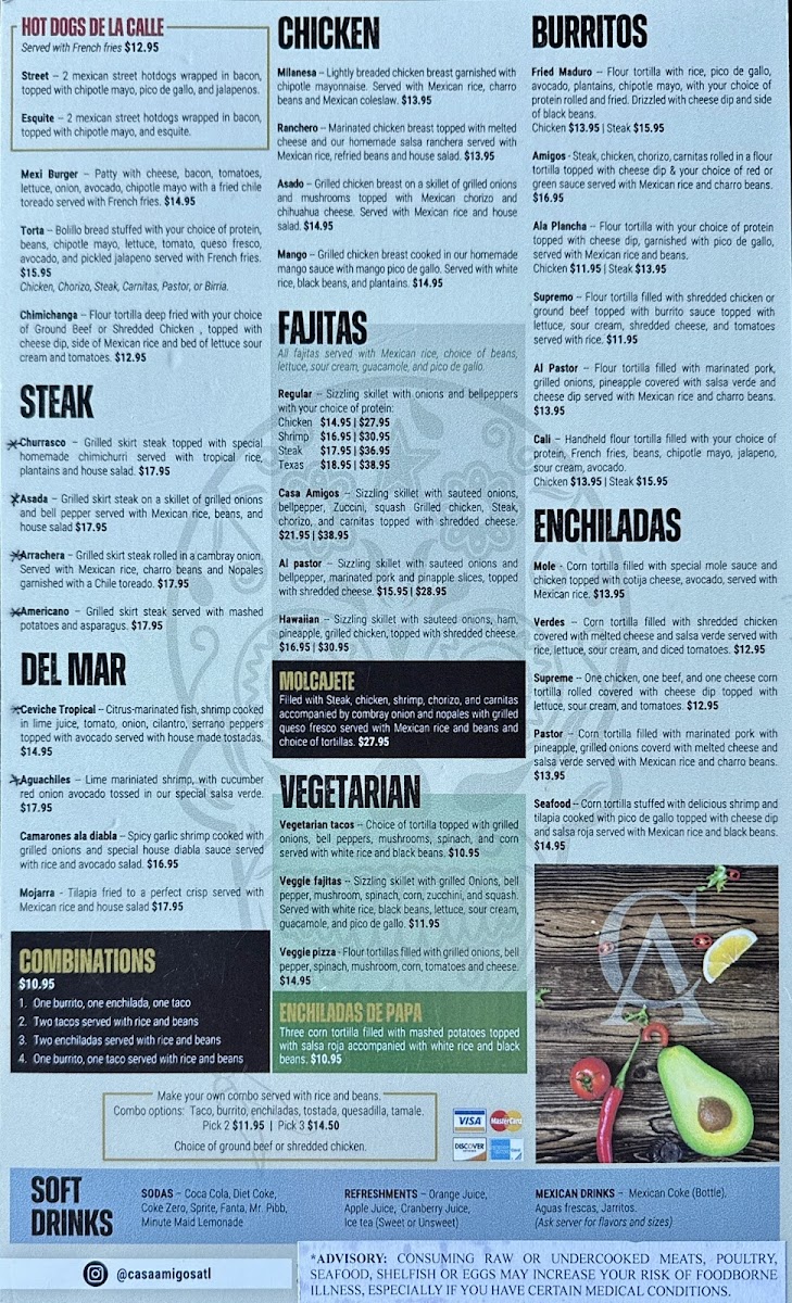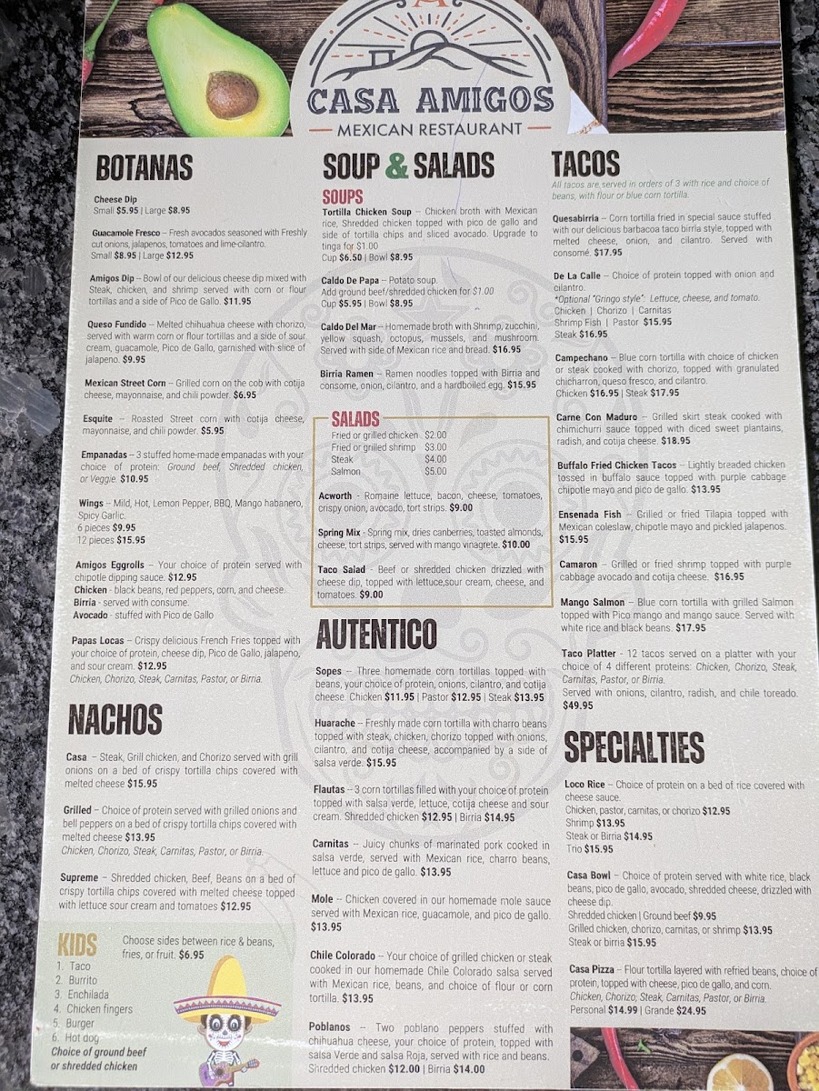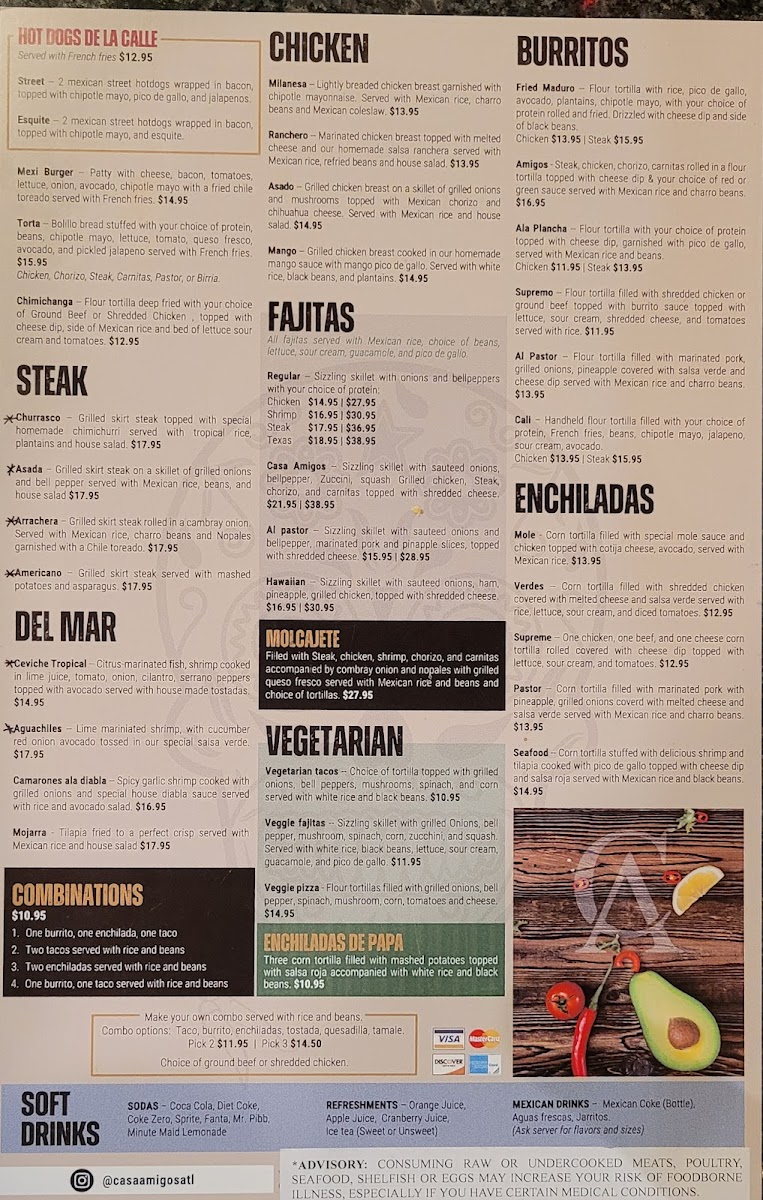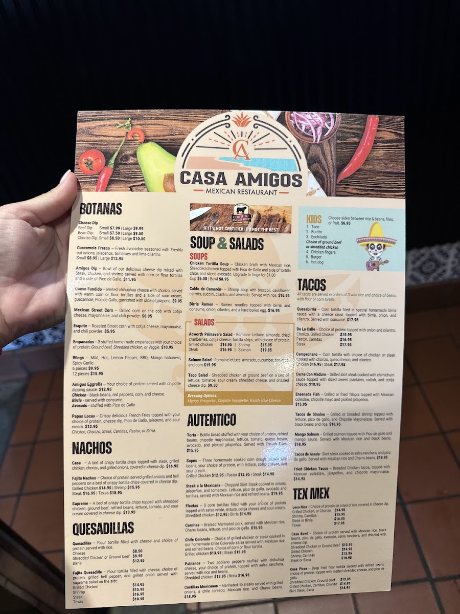 Finishing off with a touch of sweetness is easy with desserts like Tres Leches Cake, bringing a gentle, familiar close to the meal. Whether dropping by for a late-night snack or gathering with family for a weekend dinner, the menu at Casa Amigos caters to moments meant to be savored in good company and warm surroundings.