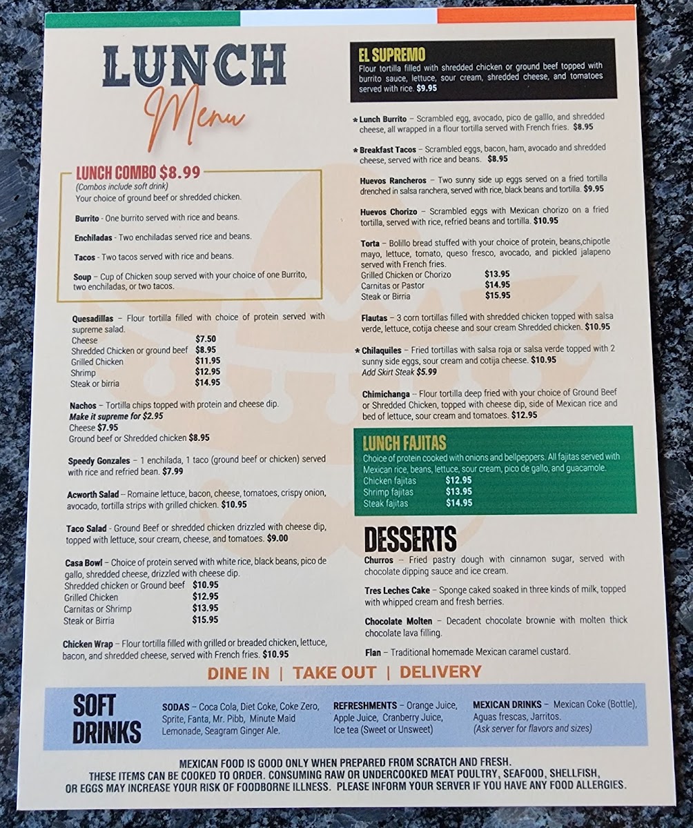 Guests can enjoy flavorful street tacos or the fresh, vibrant guacamole—ideal as a light starter or a shared snack among friends. The menu also includes satisfying favorites like the Chimichanga Meal or the Casa Bowl with Shrimp, which work well for those seeking a more filling option without straying from classic tastes.